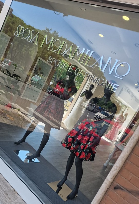 -il manifesto ( prossima apertura ) con nostra modella e nostri abiti per la vetrina
